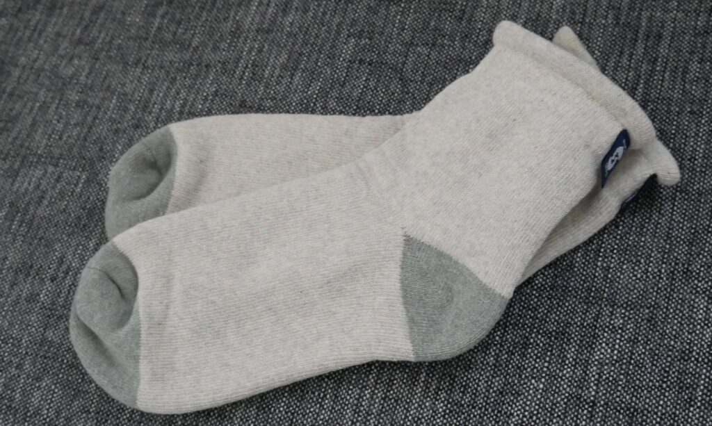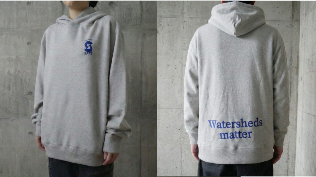 「MEGURU」では、循環素材「WACS」を用いた靴下やフーディーも用意された。廃棄される繊維を原料に戻し、再び製品へ。背中に記された「Watersheds matter」という言葉が、このプロジェクトの核心を端的に語る。