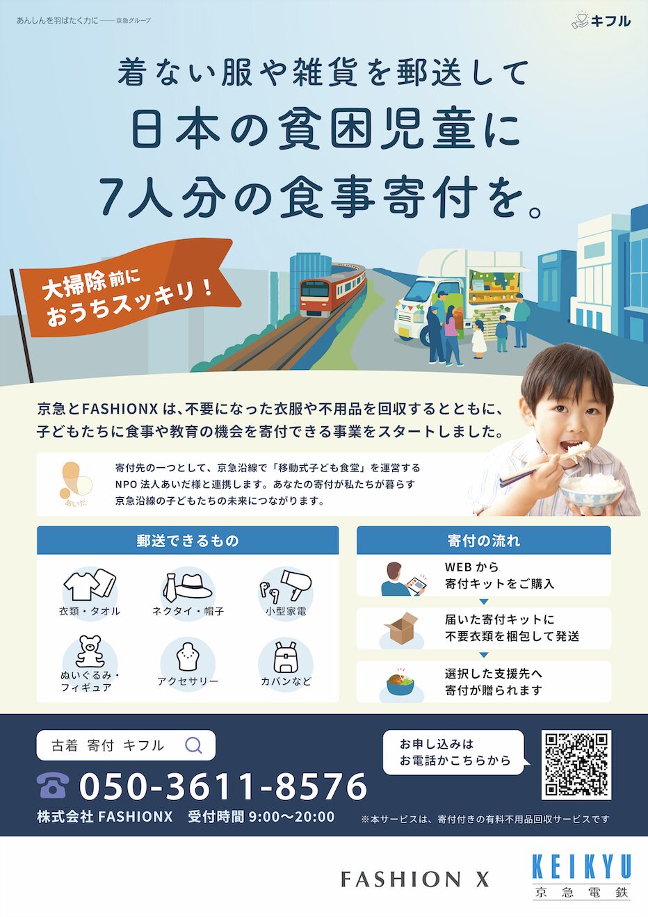 京急電鉄とスタートアップのFASHION Xが、不要な衣類や雑貨を郵送で回収し、その収益の一部を国内の貧困児童への寄付・支援につなげる新サービス「キフル」の実証実験を開始。利用者は専用キットで不要品を送るだけで、子ども7人分の食事または1人分の教育支援が可能になる。