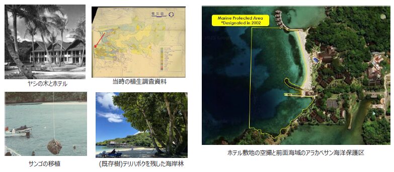 1970年代、戦争の傷跡が残るパラオの地で、同社はリゾート開発の構想を描く。事前に植生調査を行い、既存樹木を可能な限り残す計画を立てた。サンゴの移植を伴う海岸整備もその一部だった。