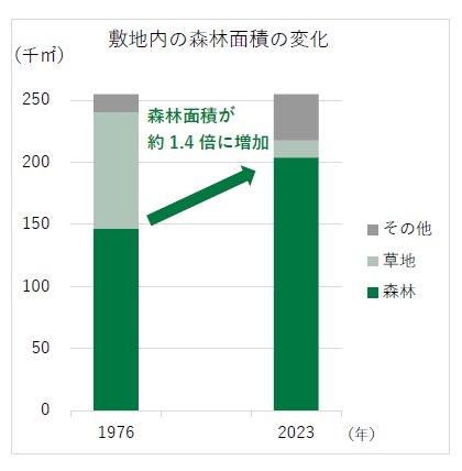 その結果を、今回のTNFD開示では、空中写真や衛星画像による解析で“検算”している。開発前後の森林面積を比較すると、建物用地として森を削ったにもかかわらず、トータルでは森林面積が約1.4倍に増加していたという。