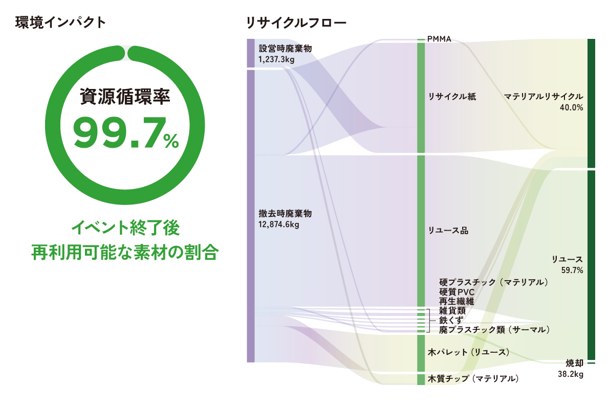 設計だけでなく、運用にも工夫を凝らした。催事の終了後、全ての資材を素材ごとに分別・計量。それぞれの資材にQRコードを付与し、回収から再資源化されるまでの全工程をデジタルで管理した。 このトレーサビリティシステムにより、どの資材が、どこで、どのように生まれ変わったのかを正確に追跡できる。「リユース」「マテリアルリサイクル」「焼却処理(エネルギー活用)」といった循環ルートを定量的に把握することで、感覚的な「エコ」ではなく、データに基づいた精度の高い資源循環管理を実現した。その結果が、目標値をも上回る99.7%という数字に繋がった。