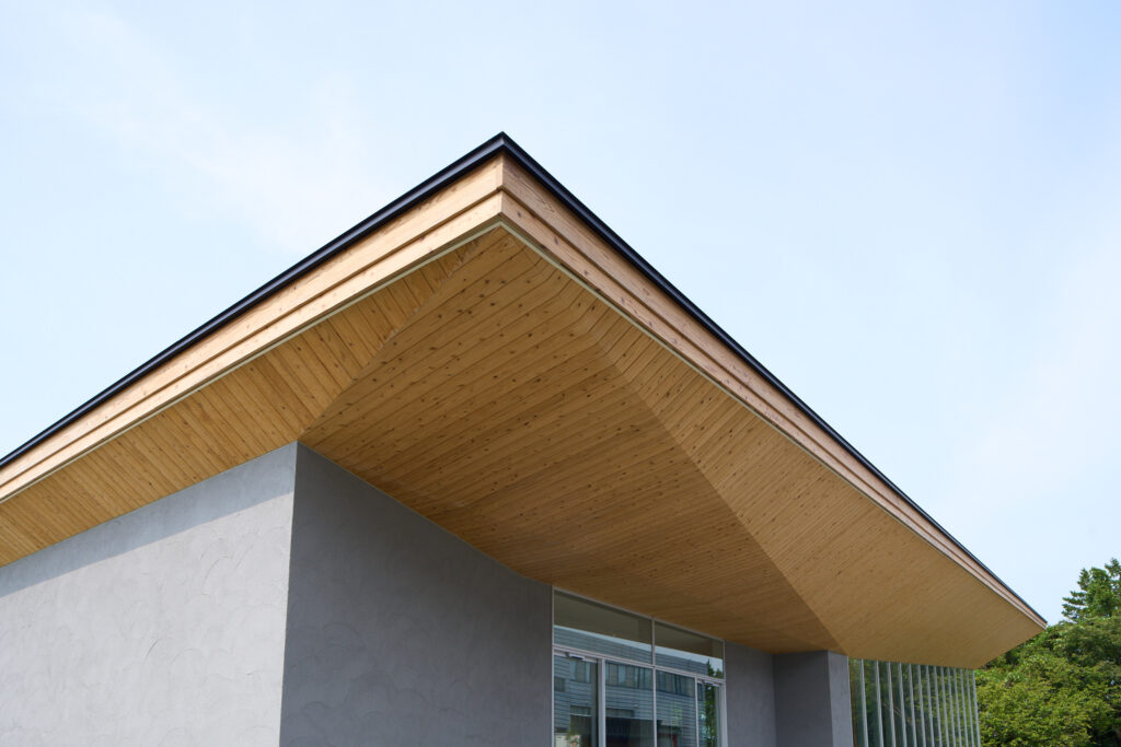 その技術の粋と、設計者の想いが強く結晶しているのが、エントランス部分に設けられた斜めに折れ曲がった軒天だ。