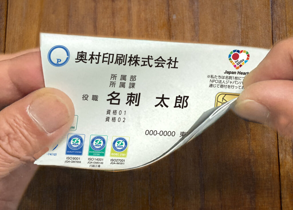 「Smart Meishi」の環境配慮は、リサイクル性だけに留まらない。製品の印刷・加工は、奥村印刷の設備において再生可能エネルギー100%の電力で行われる。製造段階から環境負荷を極限まで抑える徹底ぶりは、持続可能性への強いコミットメントを示す。