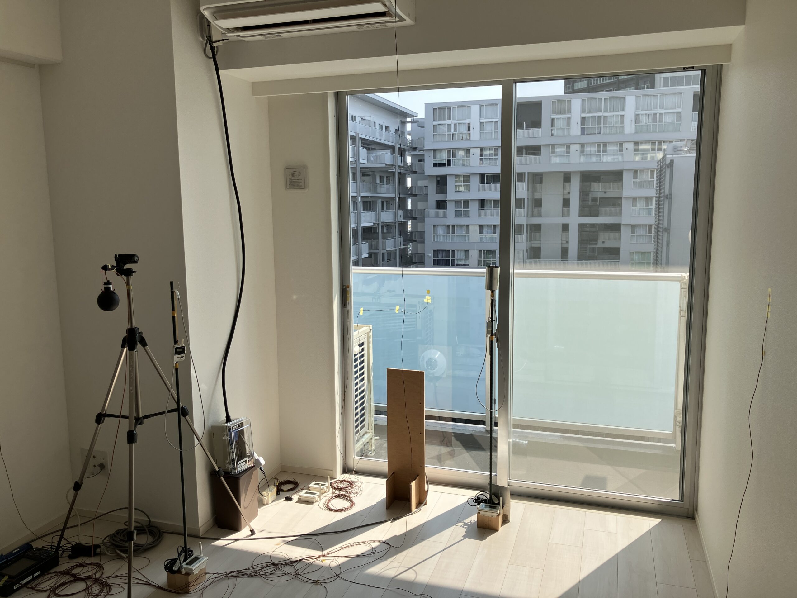 またバルコニー側にはアルミ樹脂複合窓をカバー工法で入れ替え、廊下側には樹脂製の内窓を新設。室内は7地点で温湿度を連続測定し、サーモカメラで表面温度の分布も押さえる。被験者(学生)は各住戸に交互に宿泊し、ウェアラブルで体温・脈拍・睡眠・活動量を取得。作業課題で集中度・作業効率も比べる。夏季の計測を終え、冬季も同様に行う予定だ。