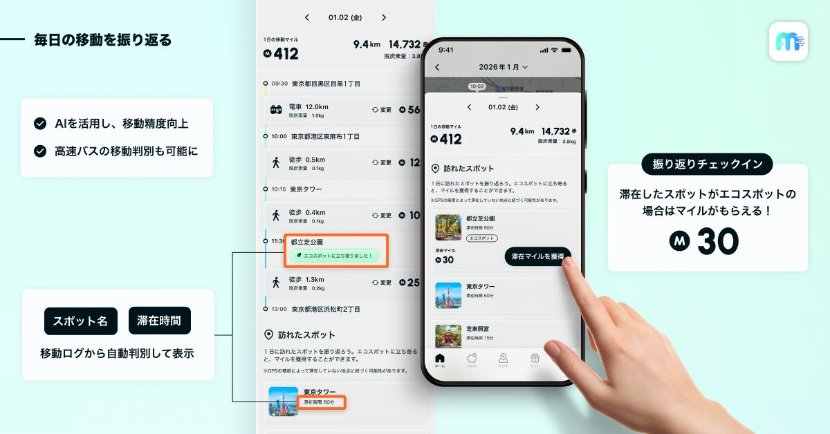 今回追加されるのは、滞在した場所を自動で特定して表示し、対象が「エコスポット」なら事後にチェックインできる仕組みだ。チェックインでマイルが貯まり、機能利用時は通常の3倍という“ごほうび”も載せた。