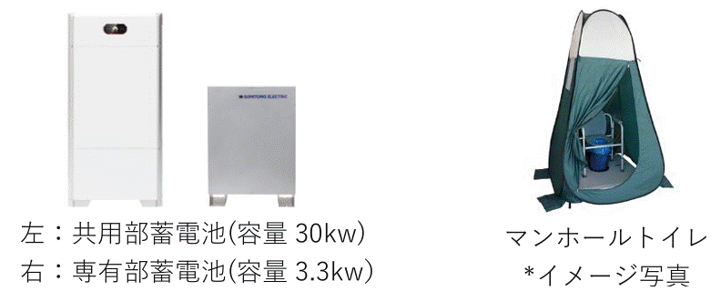 共用部には大容量の蓄電池、各専有部にも個別の蓄電池を設置し、停電時には太陽光発電と組み合わせて照明などに電力を供給できる計画だ。専有部ではエネファームの発電を活かし、停電時専用コンセントからの給電も可能とする。