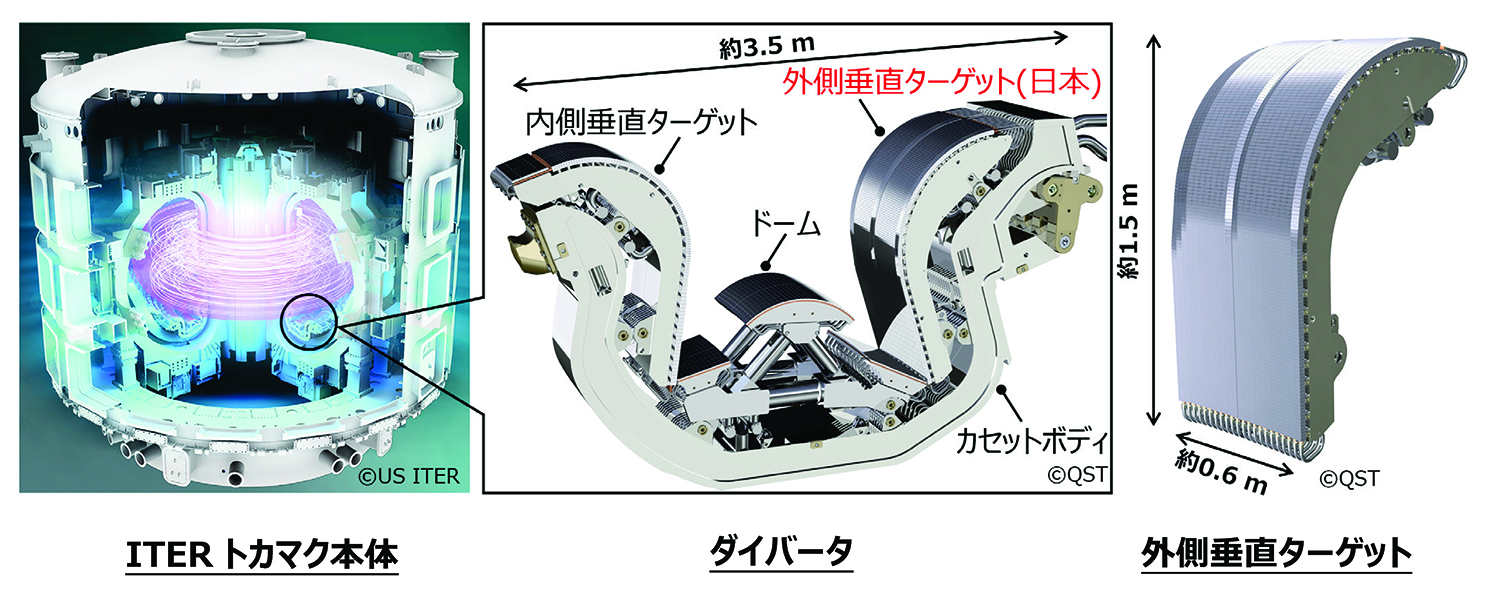 トカマク型装置の中で、プラズマを直接受け止める唯一の機器がダイバータである。燃え残りの燃料や生成ヘリウムなどの不純物を排出し、炉心のプラズマをクリーンに保つ。ITERの仕様では、対向面が受ける熱負荷が最大20MW/㎡。小惑星探査機の大気圏突入級の苛烈さだ。