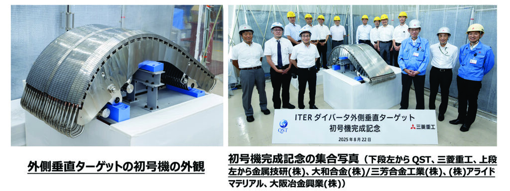 南フランスで建設中の核融合実験炉ITER向けに、ダイバータを構成する主要部品「外側垂直ターゲット」の実機初号機が完成。日本の調達機関QSTのもと、三菱重工が58基中、実機製作が進む38基すべてを担当し、2025年度から順次納入予定(企業発表、2025-09-25)。