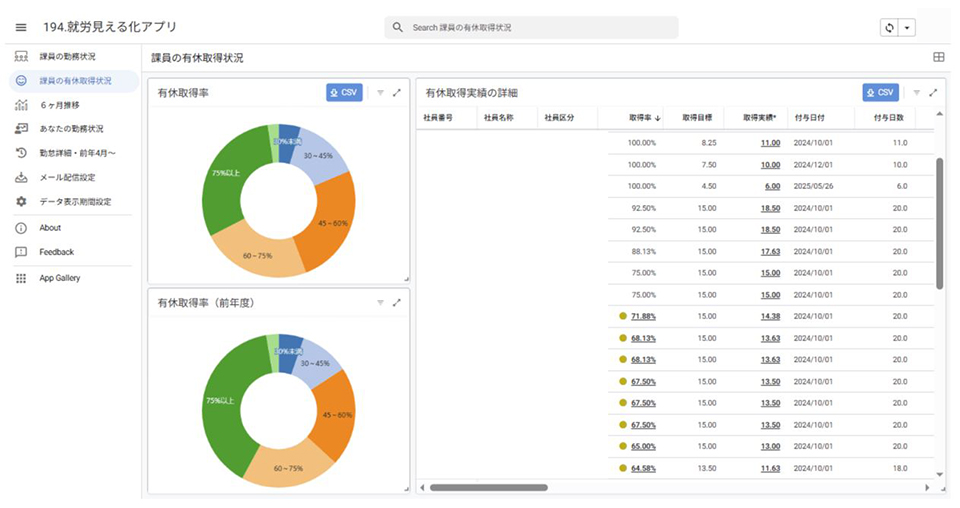 人事・マネジメントでは「就労見える化アプリ」。社員は自分の勤務・有休の状況を即把握、管理者はチーム全体の偏りを確認して業務配分や取得促進に動ける。どちらも、既存の基幹データに“寄り添う”軽い画面を足して、現場の意思決定を早くするアプローチだ。