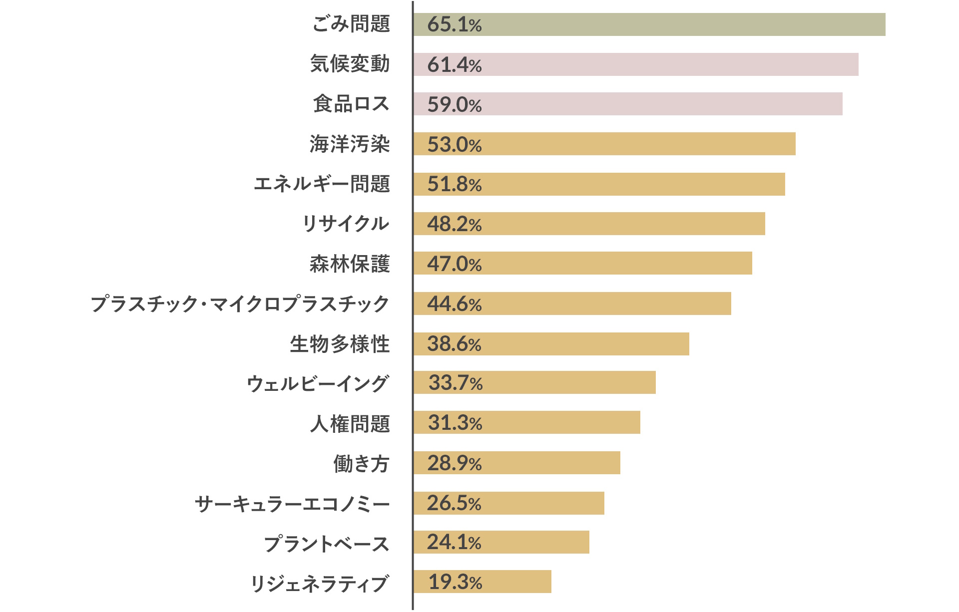 2026年に注目したい分野の1位は「ごみ問題」(65.1%)。次いで「気候変動」(61.4%)、「食品ロス」(59.0%)が続く。