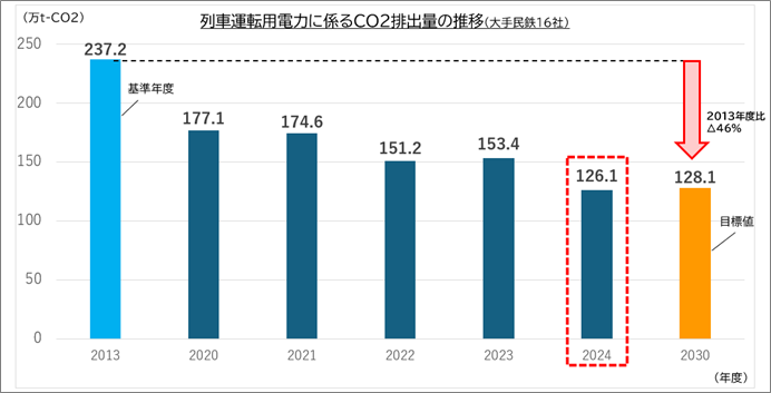 協会が掲げていた目標は、「大手民鉄16社全体の運転用電力に由来するCO₂排出量を、2013年度比で46%削減する」というものだった。それを2024年度に達成した。鉄道ファン誌系の報道では、2013年度の排出量237.2万トンに対し、2024年度は126.1万トンとなり、2030年度目標値の128.1万トンを前倒しで下回ったと整理している。