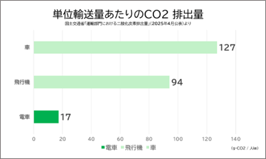 鉄道はもともと環境負荷の低い輸送手段だが、脱炭素時代には「自ら減らす」だけでは足りない。自動車や航空から、どれだけ人の移動を鉄道へ移せるか——モーダルシフトまで含めて、社会全体の排出削減にどう貢献するかが次の論点になる。国土交通省も、輸送量あたりのCO₂排出量の比較を公表し、効率のよい輸送の重要性を示している。